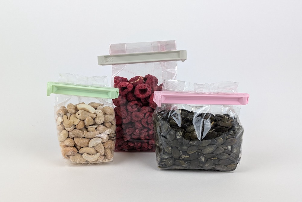 3D gedruckte Beutel Verschlussklemmen in matt Beige, Rosa und Mint, die drei verschiendene Verpackungen verschließen